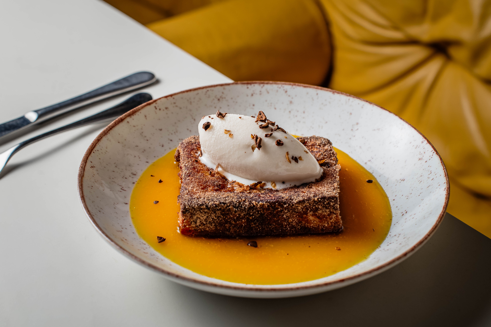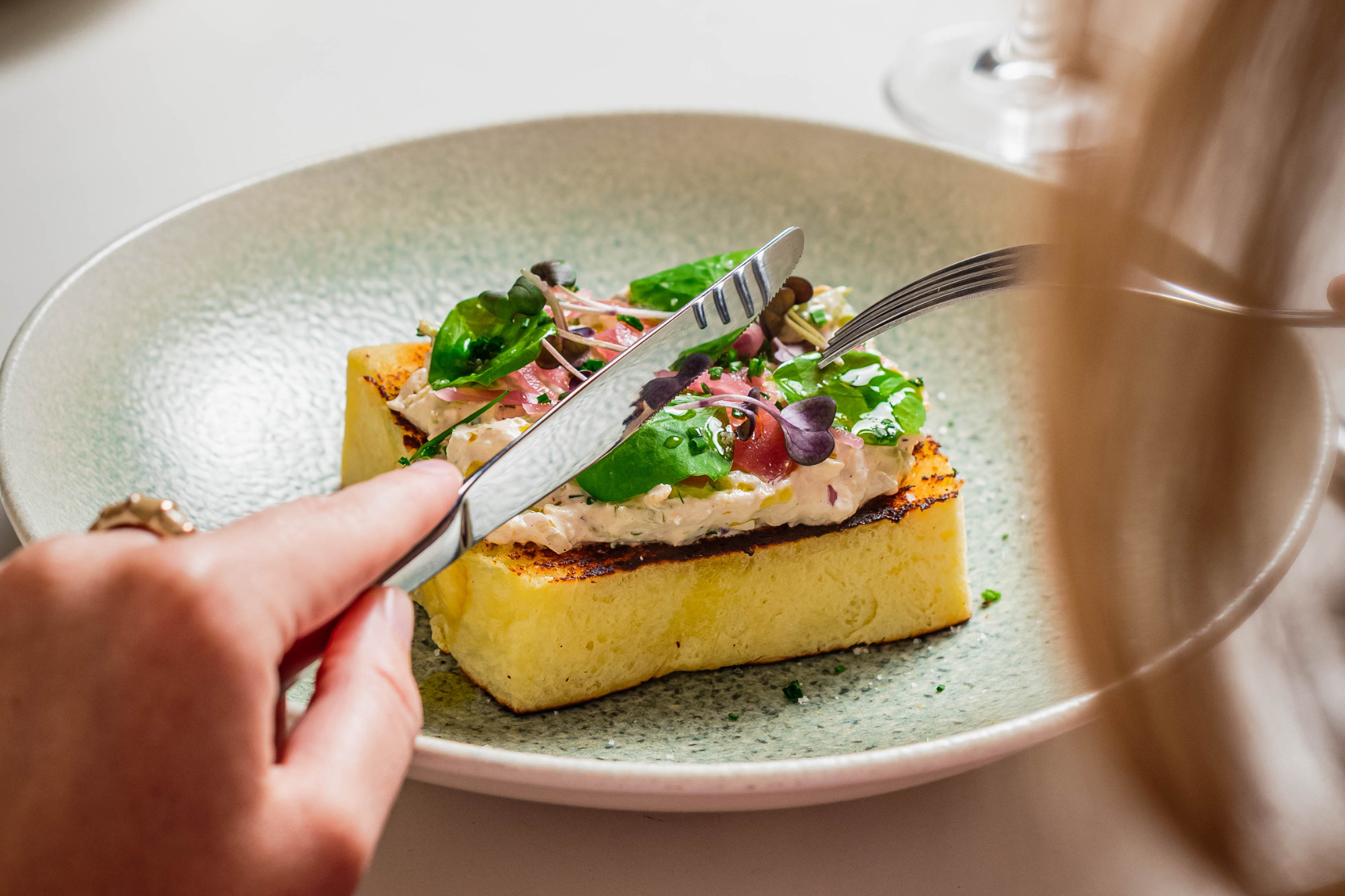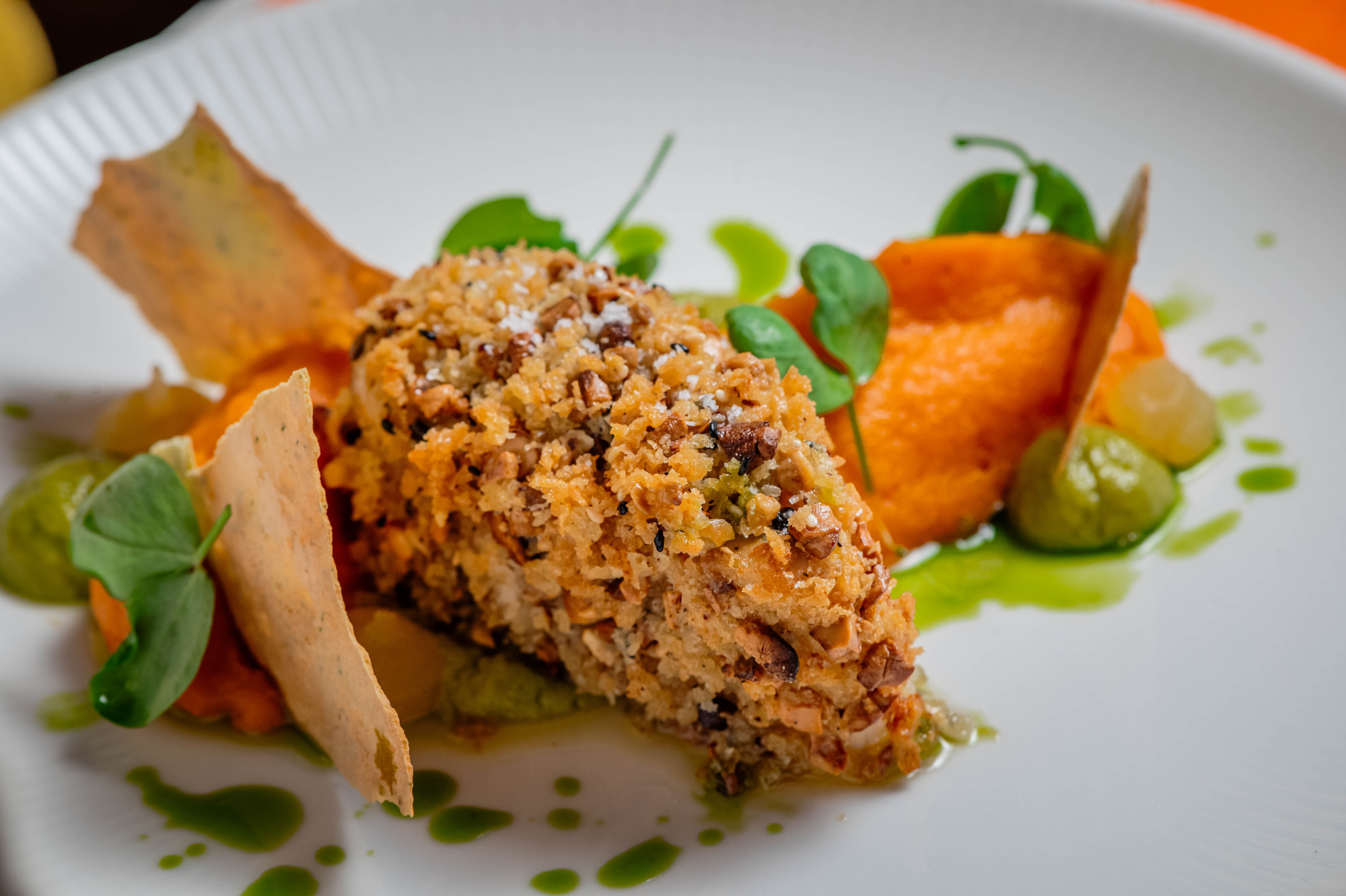 • Atum em crosta de castanhas, purê de cenoura caramelizada, emulsão de