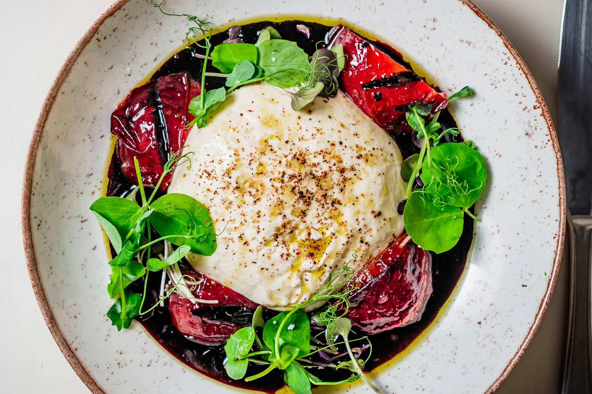 • Ameixa na brasa, burrata, melado de vinho tinto, salada de brotos
