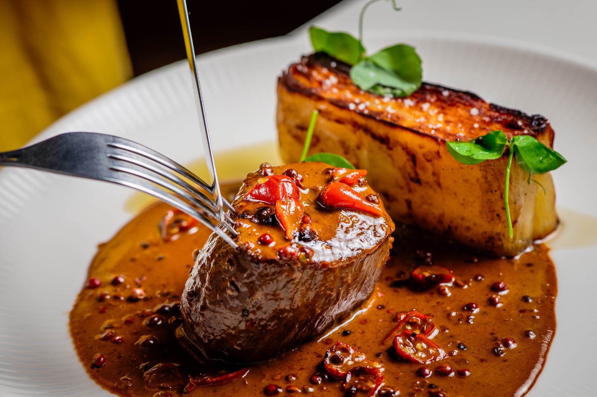 • Filé mignon au poivre de pimentas brasileiras, mil folhas de aipim