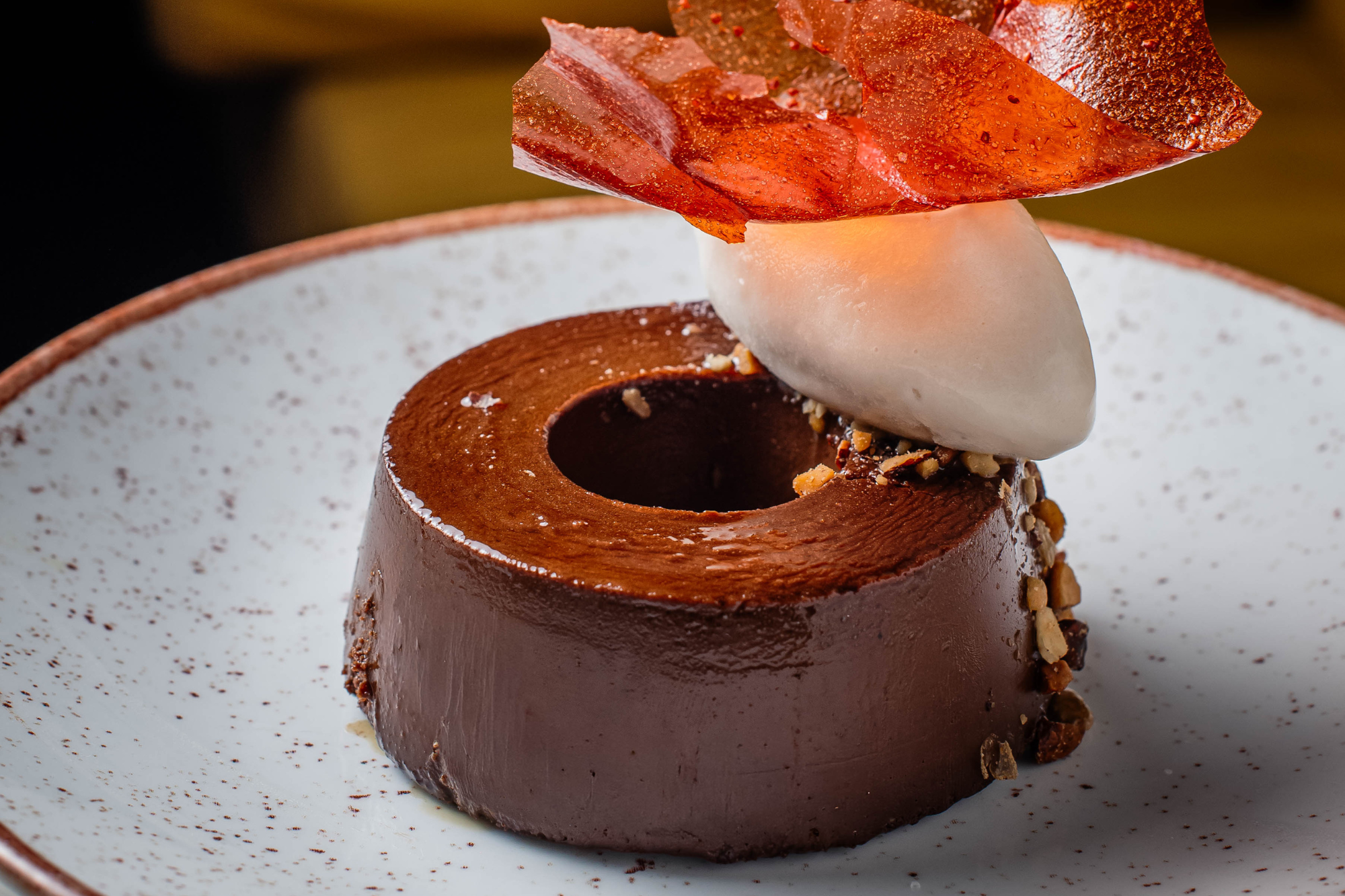 • Pudim de chocolate, sorvete de cupuaçu, farofa de castanha de caju, crocante